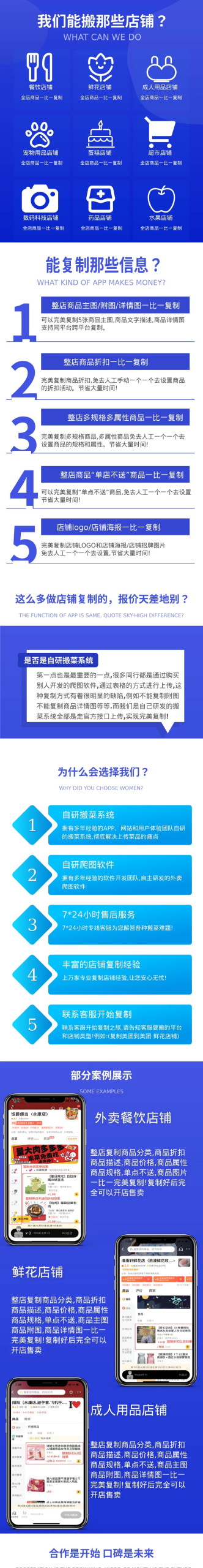 整店复制商品分类,商品折扣商品描述,商品价格,商品属性商品规格,单点不送,商品主图商品附图,商品详情图一比一完美复制!复制好后完全可以开店售卖