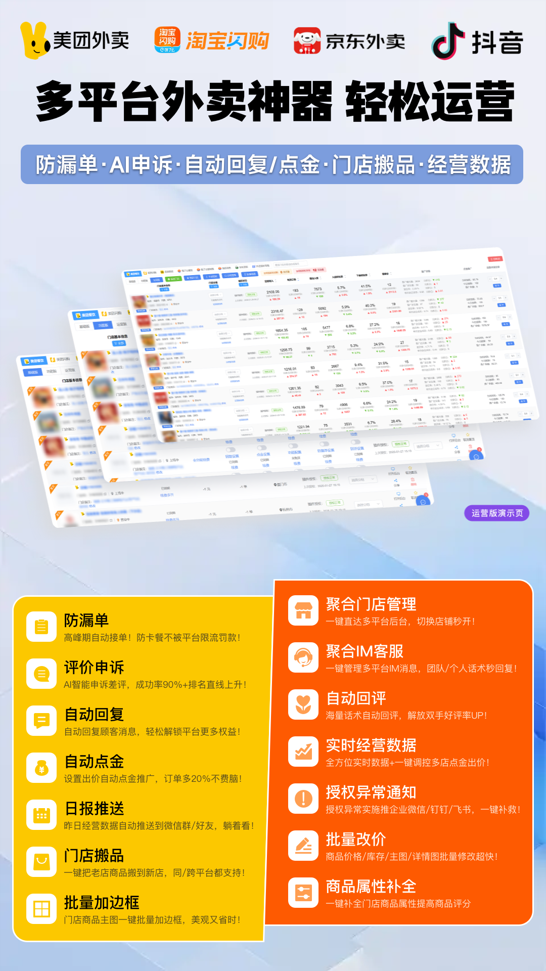 多平台外卖神器 轻松运营自动出餐·AI差评申诉·自动回复/点金·门店搬品·经营数据